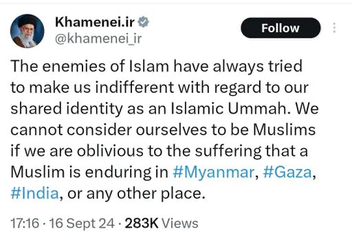 خامنہ ای نے لکھا کہ دنیا کے مسلمانوں کو ہندوستان، غزہ اور میانمار میں مسلمانوں کی تکالیف سے بے خبر نہیں رہنا چاہیے۔ ان کا کہنا تھا کہ اگر آپ ان کے درد کو نہیں سمجھ سکتے تو آپ مسلمان نہیں ہیں۔