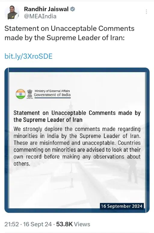 ہندوستانی وزارت خارجہ نے خامنہ ای کے بیان پر سخت ردعمل ظاہر کرتے ہوئے کہا کہ ہم خامنہ ای کے بیانات کی مذمت کرتے ہیں۔ یہ بالکل بھی قابل قبول نہیں ہے اور مکمل طور پر گمراہ کن ہے۔