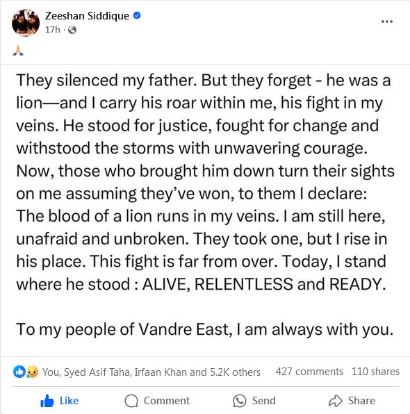 اس سے پہلے بھی ذیشان نے ایکس پر پوسٹس کی تھیں۔ 19 اکتوبر کو انہوں نے ایک شیر پوسٹ کیا تھا، ‘‘بزدل ڈرایا کرتے ہیں اکثر دلیر کو، دھوکے سے مار دیتے ہیں گیدڑ بھی شیر کو’’۔ جمعہ کو ذیشان نے مہاراشٹرا کے ڈپٹی سی ایم دیویندر فڈنویس کے ساتھ ملاقات کی تھی۔ فی الحال بابا صدیقی قتل کیس میں پولیس کی تفتیش جاری ہے۔ ابھی تک اس معاملے میں 10 لوگوں کو گرفتار کیا جا چکا ہے۔ جمعرات کو بھی ذیشان نے ایکس پر پوسٹ لکھی تھی، جس میں کہا تھا کہ میرے والد نے اپنی زندگی لوگوں کی حفاظت، غریبوں کے گھروں اور انہیں بچانے میں قربان کر دی۔ آج میرا خاندان ٹوٹ گیا ہے، لیکن ان کی موت پر سیاست نہیں ہونی چاہیے اور یہ بے معنی نہیں جانی چاہیے۔ انہوں نے آگے لکھا تھا کہ مجھے انصاف چاہیے، میرے خاندان کو انصاف چاہیے۔